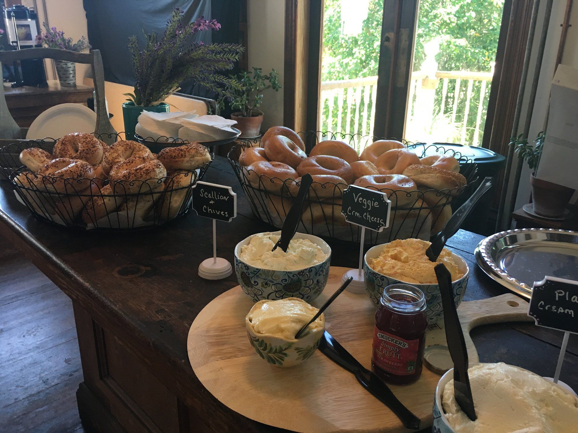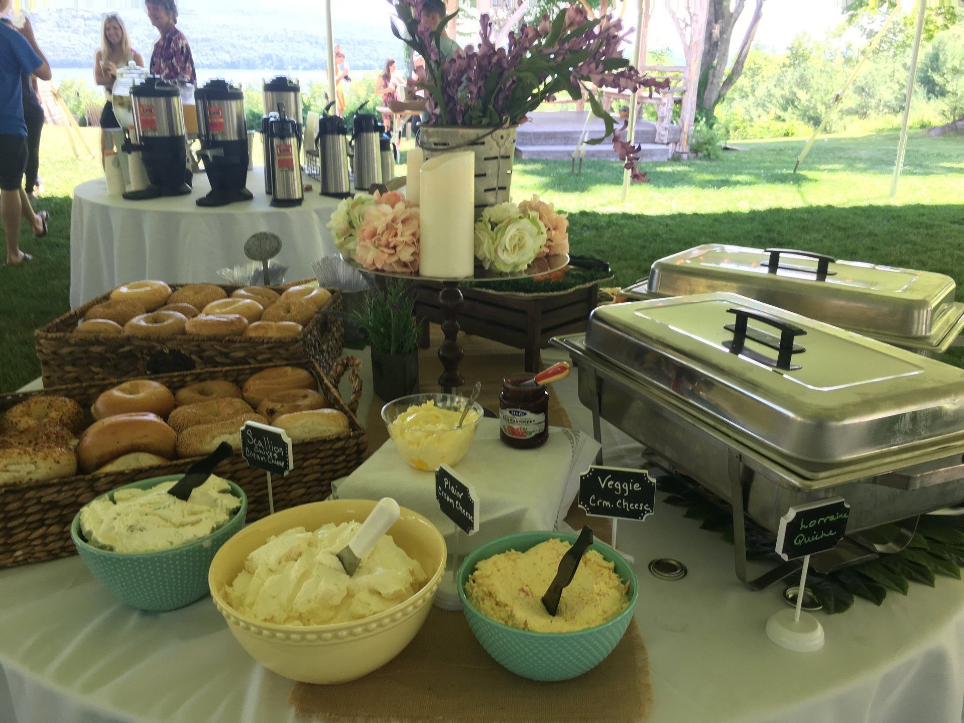 We begin with our fresh baked bagels, and include an assortment of cream cheese flavors, butter and jelly.